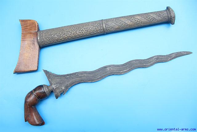 This very good Bugis Keris Dagger has a waving blade blade 14 ½ inches long, with clear pamor structure. Wood grip with silver mendak. The scabbard is covered with finely chased brass. Total Length 18 ½ inches. Very good condition. Age cracks on the grip. |
