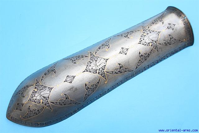 This arm guard (Bazu Band) is most probably of Persian origin, early Qajar period, late 18 to early 19 C. Very finely chiseled and inlaid with gold koftgari work. Length 14 inches. Very good condition.