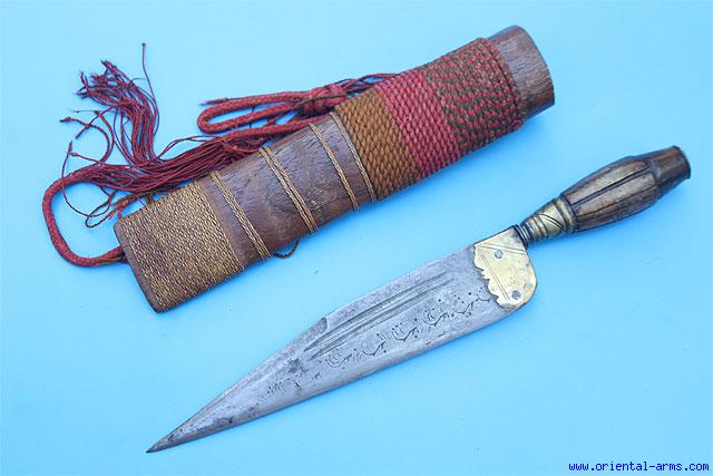 This Unusual piece is a combination of a Spanish, 18C. heavy knife / dagger mounted into a Filipino style scabbard. Blade 8 inches with a 4 inches clipped back edge. Wood grip with brass bolster. Wood scabbard bound with colorful threads. Total length 12 ½ inches. Very good condition. |