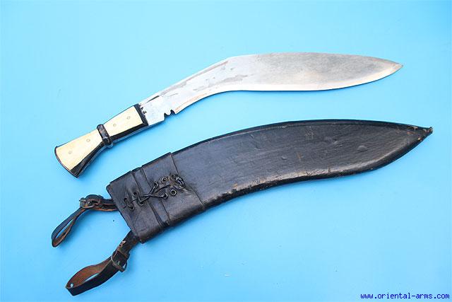 This is most probably model 1943 of the military issue Khukuri. Blade 12 ½ inches. Ivory and horn grips (full tang). Original black leather scabbard. Total length 18 ½ inches. Very good plus condition.