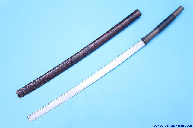 This Dah sword is Burmese, 19 C. Very well forged blade with a square tip, 22 ½ inches long. Two handed grip with large steel mount and with the grip bound with braided rattan rings and covered with black lacquer. Wood scabbard bound with rattan bands and covered with black lacquer as well. Total length 33 ½ inches. Very good condition. A real fighting sword. |