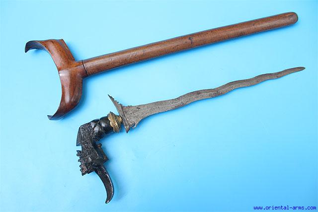 This rare Keris dagger is a Tajong, coming from the Malay peninsula, late 19C. Wavy pamor blade 15 inches long. Finely carved Tajong style wood handle with brass mendak. Original complete wood scabbard. Total length 23 inches. Very Good condition. |