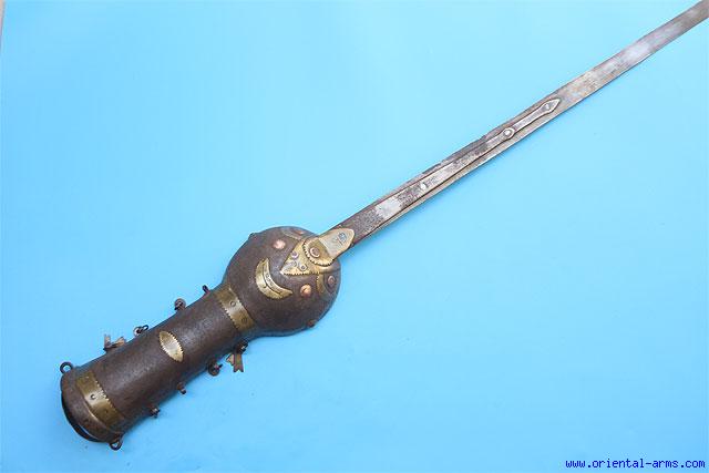 This one is probably early to mid 18 C. with a 35 inches double edge thin and very flexible blade. The hand gauntlet is made of steel with brass mounts. Total length 48 inches. Very good condition. Minor edge nicks and light pitting areas. No scabbard. A rare and impressive item.