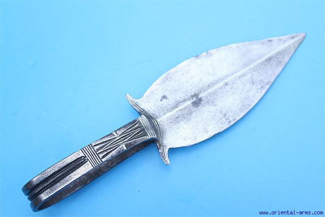 A loop dagger of the TIV people residing on the Niger river in Nigeria. Very typical but unusual whole steel construction with the ring hilt forged in one piece with the blade. Spear head shaped 4 1/2inches long blade with a central rib very well forged. Filed and chiseled ring handle. Total length 8 inches. Very good condition. Quite unusual and very elegant piece.
