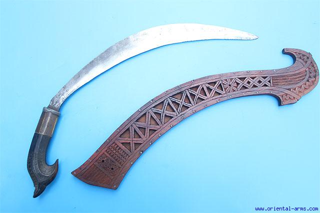 The Talibon sword is the main battle sword of the Christian tribes of northern Philippines. The blade is down curving, 13 1/2 inches long with the sharp edge at the convex side. The handle is carved horn with large brass collar . Beautifully Carved decorated and pierced wood scabbard. Total length 18 inches. Very good condition. This is a rare and unusual form for this type of swords. It is late 19c or early 20th. The scabbard is later. |