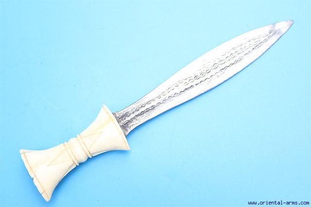 Here we offer a nice Central (?) African knife. It has an ivory handle carved with symmetrical lines. The blade is double edged 6 1/2 inches long engraved in the center. Total length 9 1/2. Very good condition. Early 20C.