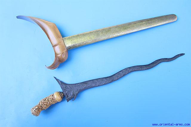 Here is a very fine Madura Keris dagger. It has 14 inches twisted core blade with very good contrast. Nice wood scabbard with engraved brass cover. Fantastic carved ivory hilt with stylized figure (Wayang God?). Total length 18 inches. Very good condition. Mid 19C. Fine piece. |