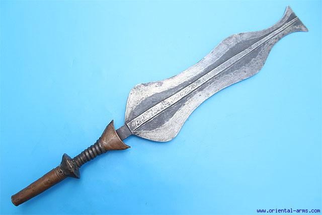 Up for sale is this rare sword of the Saka people residing in Central Zaire. Unusual form and Very well forged blade, 16 inches long, with central pronounced central rib and original blackening and blunt tip. Wood handle bound with copper sheet and strips. Very good condition. late 19c or early 20th. Very unusual form.
