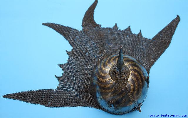 domed skull, fitted with an additional band around the base pierced with calligraphic panels between cartouches filled with exotic birds, decorated over its surface with spiralling panels of gold koftgari scrolling foliage, with tall central spike rising from a pierced base, a pair of plume-holders at the front, sliding nasal pierced at the top and bottom en suite with the skull and retained by a thumb-screw, all decorated with matching designs of gold koftgari, original mail neck-defence of brass and steel links and complete with its padded red fabric lining. 10 1/4in high.