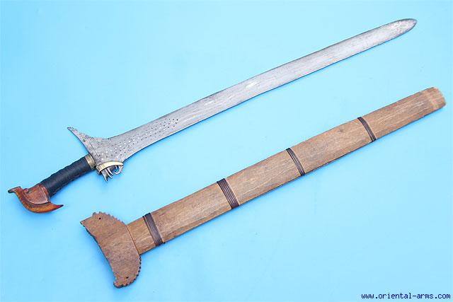 This early Moro keris sword is late 18C or early 19C with very good blade 22 inches long, forged from laminated steel and inlaid with silver stars shaped decoration. Grip with thread binding (restored) and elephant ivory pommel of very good old age patina. Brass collar and one brass clamp of the blade to the handle. Total length 28 inches. Very good condition. Original scabbard but lightly damaged at the top.