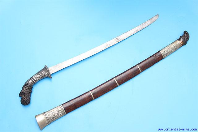 A very nice Parang sword from Indonesia. It has 21 inches long blade nicely carved horn hilt in a silver collar and wood scabbard bound with two engraved silver mounts and two silver rings. Tip of the scabbard is carved horn. Total length 33 inches. Good condition. |