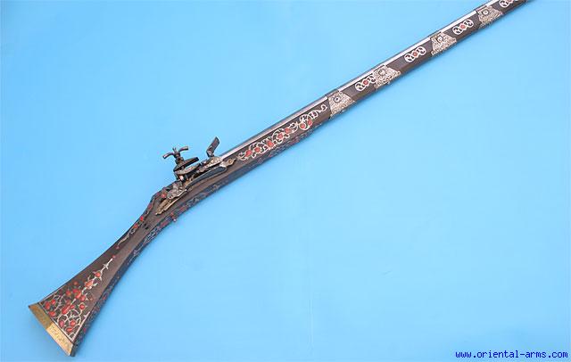This very fine long gun is coming from Algeria. It is characterized by the long Miquelet lock with a safety catch and the dense silver and coral decoration. 57 ½ inches long and heavy barrel signed on its lower side: MARLEY CARTERON (?) and a maker stamp. The lock is in good working order, with very strong spring, finely chiseled and dated 1181 ( 1767 in the Gregorian calendar) . Original ramrod with chased silver mounts. Total length 73 ½ inches. Very good condition. Very fine and rare gun. |