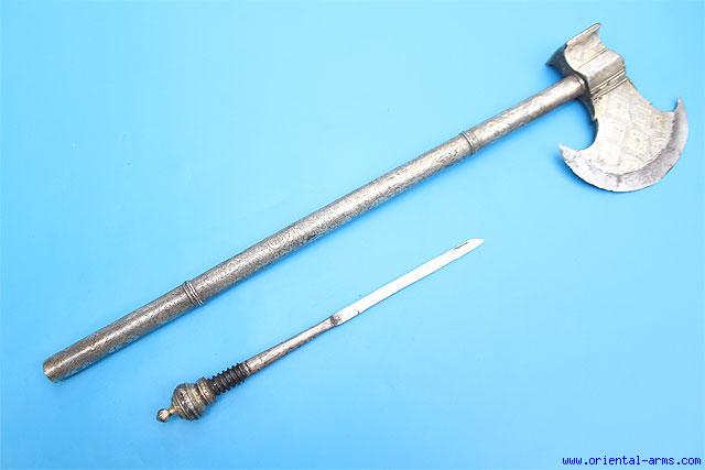 This battle Axe is Indian, mid to late 19 C. The crescent shape blade is 5 inches long . It is finely covered with silver engraved in a beautiful flowers pattern. The haft is steel 22 1/2 inches long and decorated with silver en suite with the blade. The lower tip of the haft opens to reveal a 5 inches slim blade. Very Good condition. |