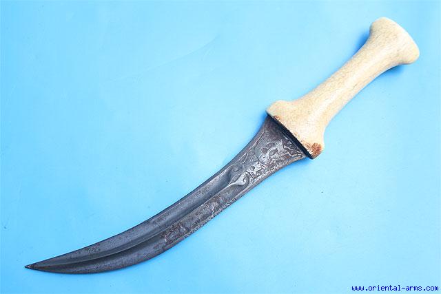 This Persian Khnajar is early – mid 19 C. , blade with reinforced edges, forged from fine wootz (Watered, Damascus) steel. Animals and hunting scenes are chiseled on the base of the blade. Blade length 7 ½ inches. Single piece walrus ivory handle. Total length 12 inches. There are several spots of pitting to the blade. |