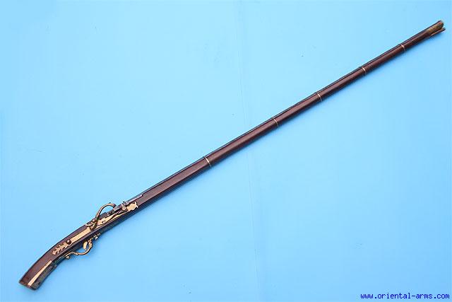 This Vietnamese matchlock gun is rare on the market in this quality. It has 40 inches long barrel, wood stock with silver bands holding the barrel. Brass lock beautiful engraved and shaped as a dragon at the tip. Engraved brass trigger guard all in working order. Bone butt and inserts. Original ramrod. Total length 50 inches. Very good condition. |