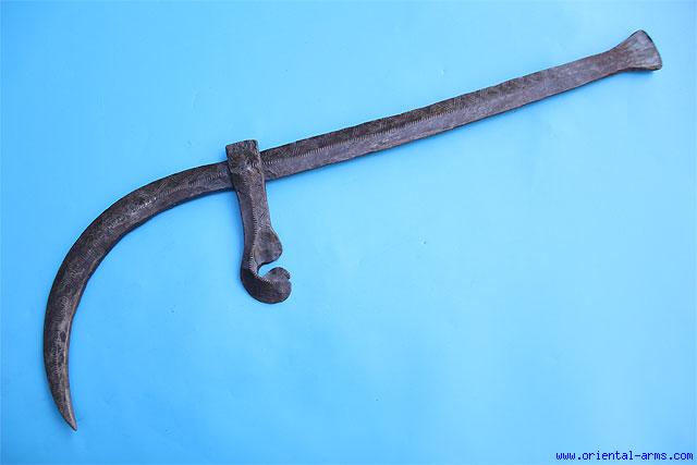 This rare form of throwing knife is used by the Mandara and Kirdi people ( also known as Sara). Simple robust construction, heavy F shaped and very effective. Light and simple geometric decoration. It is 23 inches long. Very good condition. |
