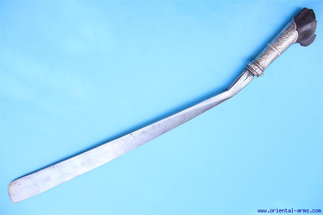 The Parang Latok is a rare Sword / Machete from Kalimantan (Borneo). It is characterized by the heavy wedge blade widening toward the tip, with its lower unsharpened part and the hilt abruptly bent upward, allowing two hands grip of the sword. This one has a 23 ½ inches blade, 14 mm thick near the hilt, a square heavy blade extension and a wood hilt with a chased silver collar.Total length 28 1/2 inches. Very good condition. |