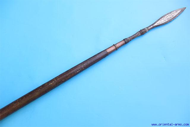 This fine spear is Indian, early 19 C. Blade 10 1/2 inches with silver and copper inlay decoration. Original wood haft covered with leather and with traces of flowers painted green. Total length 98 inches. Very good condition