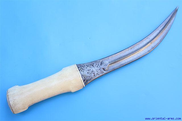 This Persian Khnajar is early – mid 19 C. ,Fine blade with reinforced edges, forged from fine wootz (Watered, Damascus) steel of high contrast. Animals and hunting scenes are chiseled on the base of the blade and inlaid with gold. Blade length 19 inches. Bone handle. Total length 14 inches. Bottom cup of the hilt is later replacement. |
