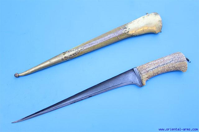 A very fine ‘KARUD’ (the common name for a ‘Pesh-Kabz’ with straight blade). from North India or Afghanistan origin. A very fine wootz blade 12 inches long with acute point and reinforced T spine. The hilt carved from a single piece of walrus with beautiful pattern and age patina. The bolsters are steel. The scabbard is wood covered with pale yellow velvet and mounted with gilded silver fittings. Total length (in scabbard) 18 inches. Very good condition. Very fine wootz of high contrast. A very high quality item. |