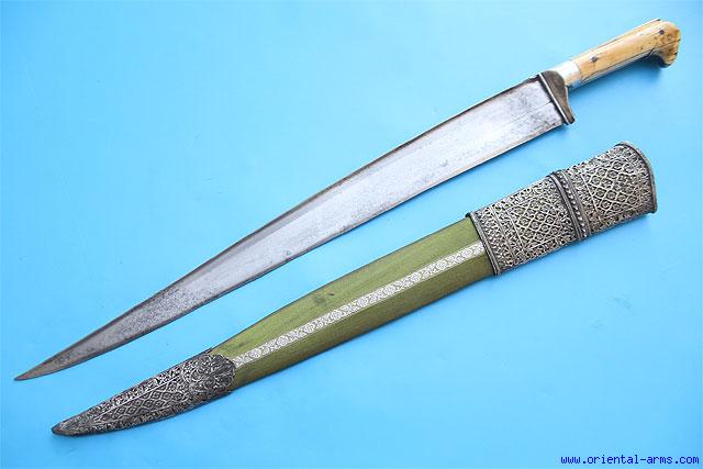 This fine a example of a Indian Khyber sword is coming from North India, early – mid 19C. The heavy blade is 20 inches long , with a pronounced T spine. Fine elephant ivory grips with silver grip strap and silver bolsters. Original wood scabbard with original green faded velvet cover and beautiful pierced silver mounts. Total length 26 inches. Very good condition. Minor ivory chips on one grip. Very good age color on the grips ivory.