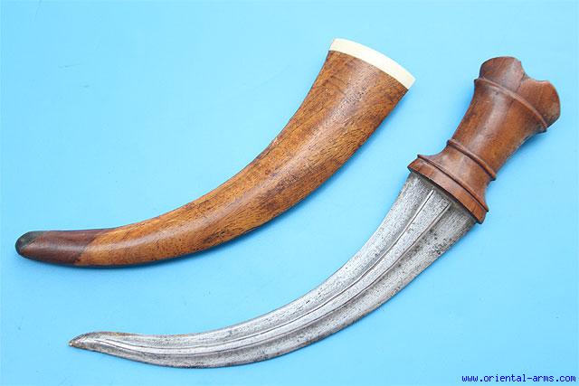 This Indonesian dagger in the style of an Arab Jambiya is also known as and found in Sumatra and Mentawi islands. Its curved blade is 8 inches long, with pronounced central ridge and forged from pamor steel. The handle and scabbard are hardwood and the scabbard mouth is made of ivory. Total length 12 ½ inches. Very good condition. The bottom of the scabbard made of different color wood and might be an old repair. Quite a scarce item |