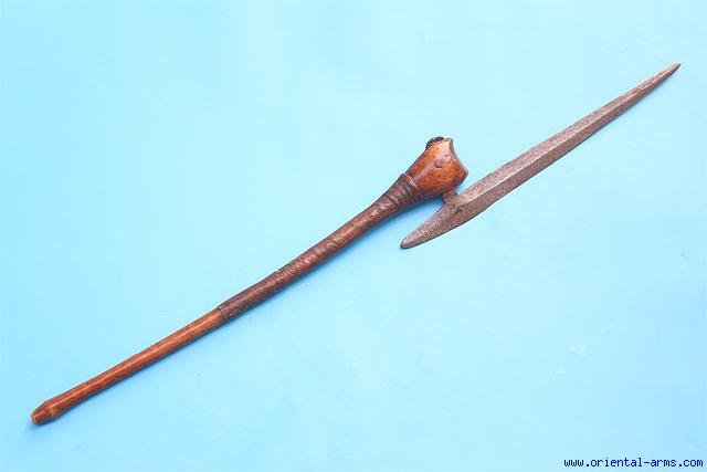 We offer for sale a real, authentic and complete 19 C. axe of the Tonga from Mozambique (but also used by the Shona of Zimbabwe). A 15 1/2 inches long halberd shaped blade, well forged, mounted on hardwood haft with hide cover. Excellent condition with original patina well made blade. total length 33 inches. |