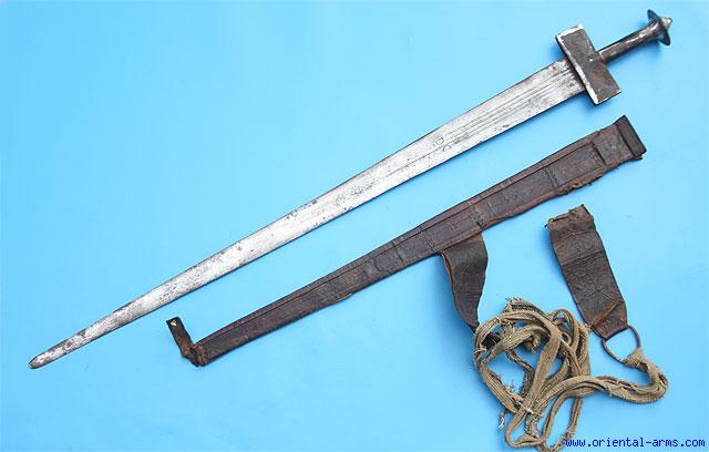 This very good Takouba the sword of the has a wide double edge 32 inches long and more than 2 inches wide blade, marked with a styled Moon mark. Most probably local made blade. The hilt is of the classical Takouba design made of steel with remains of black paint. The scabbard is tooled leather and comes with the original cotton carrying cord . Total length 38 ½ inches. Good condition. Minor pitted spots on the blade. The scabbard is worn and partially damaged and the metal tip is missing. Very low price. |