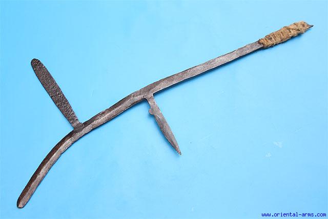 This unusual throwing knife is most probably coming from the Mandara and Kirdi people ( also known as Sara), residing in Chad and Cameroon. Simple and somewhat crude construction, F shaped with unusual back spike, normally not found on similar throwing knives from the area. It may be a local version or a later added spike, but definitely an old variation. Cord covered handle. 28 inches long. Very good condition. |