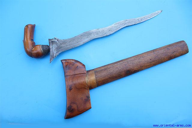 This very good Bugis Keris Dagger has rather large dimensions: Massive 15 ½ inches wavy with good pamor structure. The mendak is brass. The large handle and the scabbard are carved from a grained wood. Total Length 18 ½ inches. Very good condition. Old repairs on the scabbard. |