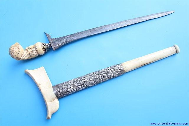 Here is a very nice and rare Sumatra keris dagger. Early19c or earlier. Carved ivory handle in a stylized bird shape. The 12 inches blade is early one and a bit corroded at the top.