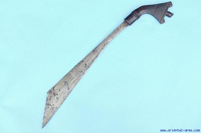 We offer for sale a rare sword from Sulawesi (Celebes) island. It is from the Klewang family but of a rare form. The blade is heavy, 19 ½ inches long with a clipped at it widest point (3 inches) near the tip. The blade is forged from laminated steel. The handle is hardwood forked and with a central protrusion shaped like a face. Total length 26 inches. Very good condition. Few darkened spots on the blade and a very few age crackes on the wood hilt. A rare find. |