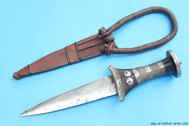 Up for sale is this fine and early arm dagger from Sudan. 6 ½ inches well made blade. Black wood grip with fine filigree silver mounts bounds with silver wired on the grip. Tooled leather scabbard. Total length 11 1/2 inches. Very good condition.