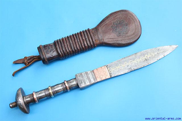 This fine dagger is from the west Sahara region, early 20 C. , used by the Tuareg and others residing in the region. Finely forged blade 7 inches long of a flat diamond cross section inlaid with brass design and engraved copper bolster. Engraved steel handle decorated with brass and copper rings and very nice large round steel pommel. fine tooled leather scabbard. Total length 11 inches. Very good condition. A fine dagger of good quality and rare shape.