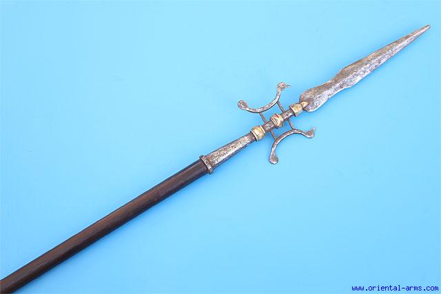 This heavy spear is Chinese, mid - late 19 C. The blade is 12 ½ inches long with a 9 inches socket decorated with birds shape side extensions. Original wood haft. Total length 85 inches. Very good condition. Small areas of blackening and pitted areas on the blade and the socket.