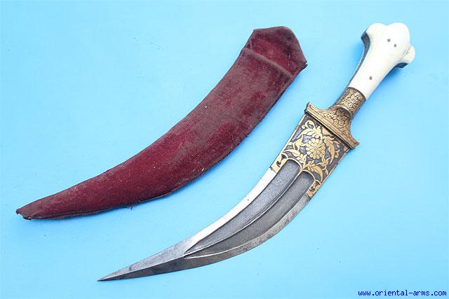 The family of daggers known as Tiger Teeth are coming from North India, They are characterized by the curved blade with reinforced edges and slightly thickened tip. The hilt is of a full tang style, with big bolsters, wide grip strap and very typical three lobed pommel. This specific one has a fine 8 1/2 inches blade forged from fine wootz (Damascus, watered) steel with fine and rich gold koftgari work on the ricasso bolsters and grip strap. The grips are ivory. Original fabric covered scabbard. Total length 13 1/2 inches. Very good condition. Minor losses to the gold koftgari work. Small repair on the ivory at the pommel corner. |