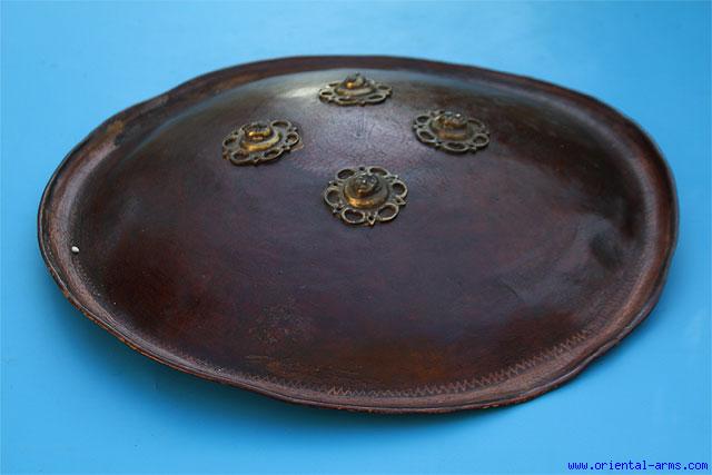This shield is coming from Rajhastan, India 19 C. Made from the hide, most probably Rhino hide 17 ½ inches diameter, hand painted with gold colors on dark red background and set with four brass bosses. Velvet covered hand cushion and handles (later) on the red painted inner side. Very good condition. Age cracks on the paint with some losses on the perimeter. |