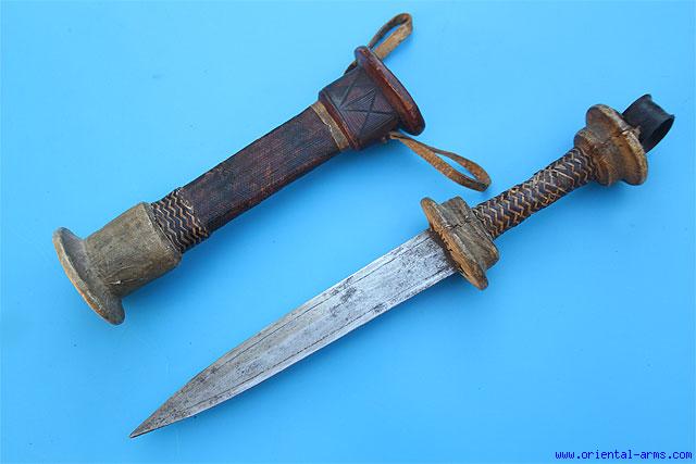 This Manding dagger is early – mid 20C. 13 inches blade. Grip bound with braided leather strips and large disk shaped pommel and cross guard and a steel ring pommel. Tooled leather scabbard. Total length 18 inches. Very good condition. Very minor losses to the leather binding of the grip. |