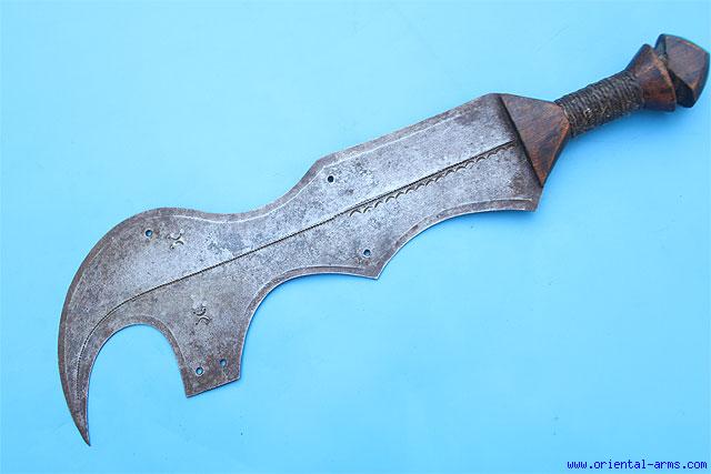 This type of sword is common between the Ngombe people of central Zaire. There are many legends concerning the use of such swords for execution. Either it is right or wrong, it is definitely a very interesting sword and always was regarded as a symbol of status. This one is definitely too small and too light to be used for execution but it is a fine piece of its kind. Very well forged blade, nicely decorated , 11 inches long. The hilt is wood with the grip bound with thread. Very good plus condition. |