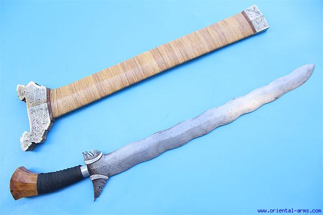 Here is a nice Moro Keris. 18 inches wavy blade with no Ganja. Aluminum fittings. Nice engraved mother of pearl plaques. Wood covered with rattan scabbard. Nice grained wood pommel. It is mid 20C made. Very good condition.