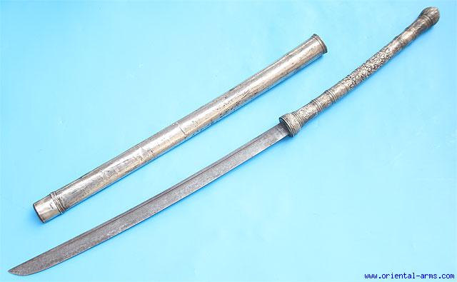 This sword is Thai, late 19 C. and of impressive dimensions. Massive blade 22 1/2 inches long. Beautifully chased long silver handle. Silver covered scabbard. Total length 40 inches. The tip of the scabbard is restored. Minor edge nicks. A fine and impressive sword. |