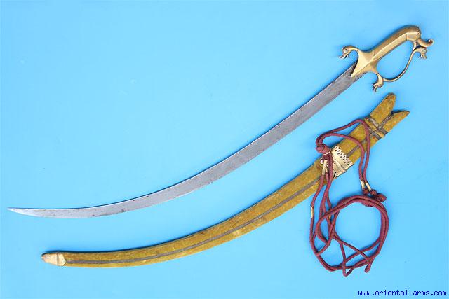 The 31 inches long blade is forged from good quality pattern welded steel but of low contrast and inlaid with gold inscriptions on the base. The beautiful handle is made from gilded copper in a form of a makara head and the down curving quillon terminals and hand guard are formed in a shape of makara heads as well. The eyes are set with Turquoises stones. The wood scabbard is covered with yellow faded velvet and mounted with two nice gilded copper mounts. The sword has its original red carrying cord. Total length 37 inches. Very good condition. Late 18C or early 19. a rare impressive and elegant sword. |