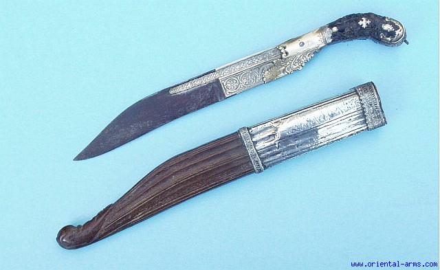 This type of knife / dagger is called “PIHA KAHETTA”, and it is the traditional knife of the Sinhalese from Sri-Lanka (Ceylon). It always has a single edged short heavy down curving blade, and the hilt is elaborately decorated in various techniques of decorative arts. This specific example has a thick blade 7 inches long, but only about 5 inches of the blade length has an edge, the rest is elaborately chiseled in a beautiful floral design. The bolster itself is brass, also chiseled in a similar design. The grips are made from dark brown horn, engraved and set with chased silver mounts. Wood scabbard with silver locket. The condition is very good. The blade shows a very nice daerk and shining age patina but no pitting. This is a VERY RARE piece in good condition and a very interesting addition to any collection. |