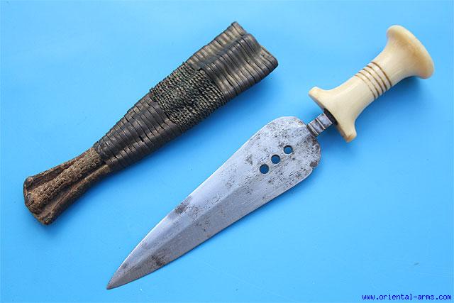 Here we offer quite rare short dagger of the Mangbetu people. The Mangbetu live in north east Congo and were famous for their high quality art and craft especially musical instruments and weapon.The daggers has very nice double edged hand forged blades 5 1/2 inches long. original leather scabbards covered with nice wide brass strips. Carved Ivory handles. Total length 9 1/2 inches. Early 20th Century.