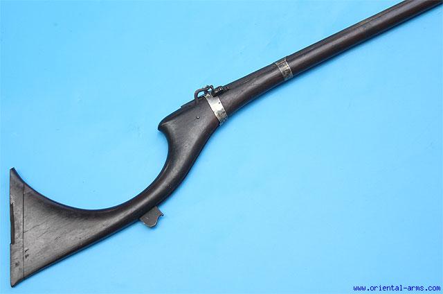 Up for Sale this matchlock gun from Sind, late 18 – early 19C. Sind is located between Indian in the east Baluchistan in the west and Pakistan in the north. The 43 inches long heavy barrel is forged from fine twisted steel (Damascus) and signed in gold. Dark hard wood stock and silver bands holding the barrel. Total length 61 inches. Very good condition. Minor wood chips on the but. Old repairs on the wood.