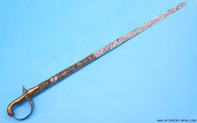 up for sale i a very rare early 19c Indian sword. It has an European style handle with large guard fully inlaid with fine Indian work of gold decoration typical to the period. The 37 inches long blade is blued at its top part and decorated with figures in gold and with geometrical engraving. The rest of the blade is fullered and has some punch decoration. The blade is either European made or European style Indian made. This sword is coming from the famous French collection of Mr. Charles Boutin that was collected in the early 20C and published in 1933 photo attached. Very good condition.This is a rare Interesting Indian sword of good quality. |