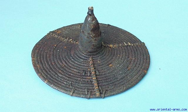 We offer for sale a rare Buckler (Hand Shield) of the Batammaliba tribe residing in the northern areas of Togo and Benin, just on the borders of Burkina Faso. This is basicly a defense shield used mainly against arrows but now also in use as a ceremonial artifact used in war dances and other ceremonies of the Batammaliba people. It is 11 inches in diameter, made of spiral canes wrapped with thin rattan fibers and reinforced with radial rattan strips. A spiral cane cone rises from the center of the shield covered with animal hide (probably a phallic symbol). For more details on this bucklers please see: Boucliers d’Afrique, d’asie, du Sud-Est et d’Oceanie du Musee Barbier-Mueller. p.36. Good condition. Two of the radial strips are missing and very few rattan fibers are broken. |