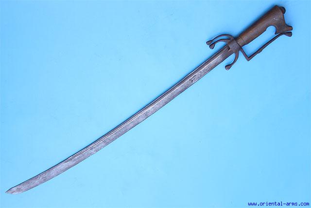 A very good example of the “NIMCHA”, the famous Moroccan saber. It has a 30 inches, slightly curved single edge heavy stamped blade, possibly of European origin. The grip is cut and shaped from a solid piece of rhino horn with clear fibrous structure. The cross guard and the “D” guard are forged in one piece of steel with the typical three prongs down curving quillons. Total length 36 inches. Very good condition. The grip collar is missing. No scabbard. |