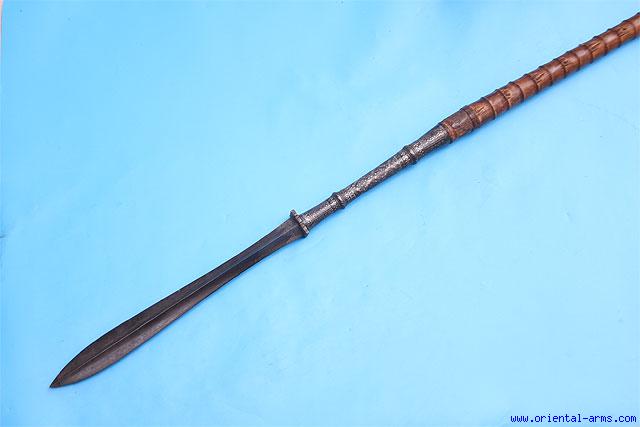 This fine large spear is Thai, late 19C. 16 inches massive blade of hollow ground diamond cross section. 10 inches steel collar richly decorated with silver inlay work. Wood shaft narrowing toward the tail for good balance. The haft is finely carved with many small images of bugs (?) tails on its entire length. Total length 89 inches. Very good condition. Good smooth age patina on the blade. Small losses to the silver inlay and minor chips top the wood carving. A fine and very impressive spear. |