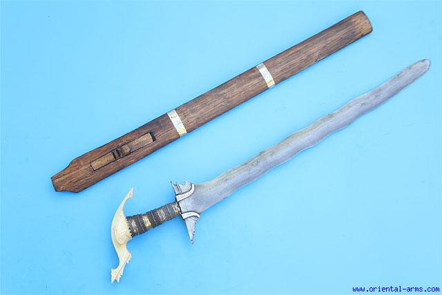 This fine Juggayan style Kris sword is Moro, South Philippines, early 20 C. or earlier. Wavy blade 20 inches long, forged from steel core and high carbon steel edges. Wood grip covered with gilded silver bands separated with bands of twisted silver wires and ending with a very big 6 ½ inches long ivory, pommel. Two silver clamps (Baca Baca). Later made wood scabbard bound with silver / white metal bands. Total length 31 inches. Very good condition. |
